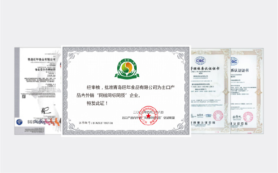 旺年堅持以食品安全作為發(fā)展的基石,除通過ISO9001、ISO14001、ISO45001、HACCP等體系認(rèn)證外,還成為了業(yè)內(nèi)為數(shù)不多具備出口食品生產(chǎn)企業(yè)資質(zhì)、通過英國零售商協(xié)會(BRC)頒發(fā)的全球食品安全標(biāo)準(zhǔn)A級認(rèn)證并獲得出口產(chǎn)品內(nèi)外銷“三同”證書的企業(yè)之一,產(chǎn)品出口美國、加拿大等多個國家和地區(qū)。